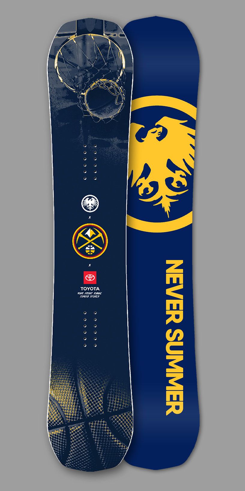 This snowboard was designed in my time working at Never Summer,as a promo board for our partner, Front Range Toyota Stores, and the Denver Nuggets. Using basketball imagery in a duotone color scheme matching the Nuggets’ branding, this board is clean, simple and to the point. As promo boards, these are not for sale and can only be won at Denver Nuggets games or through Toyota promotions in Colorado.